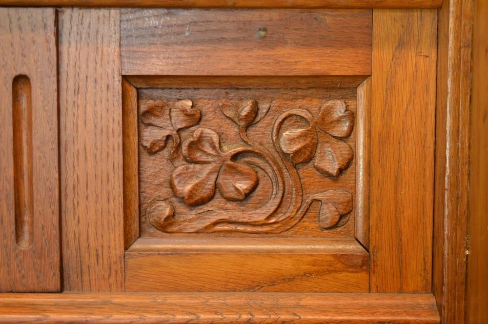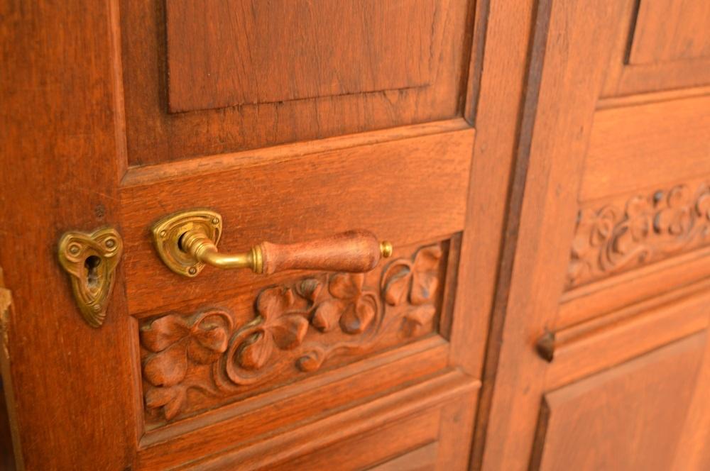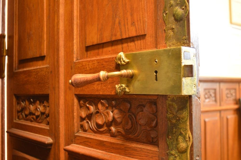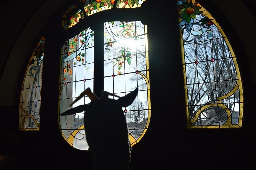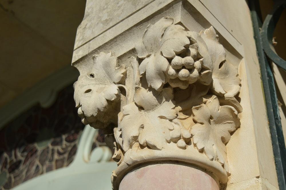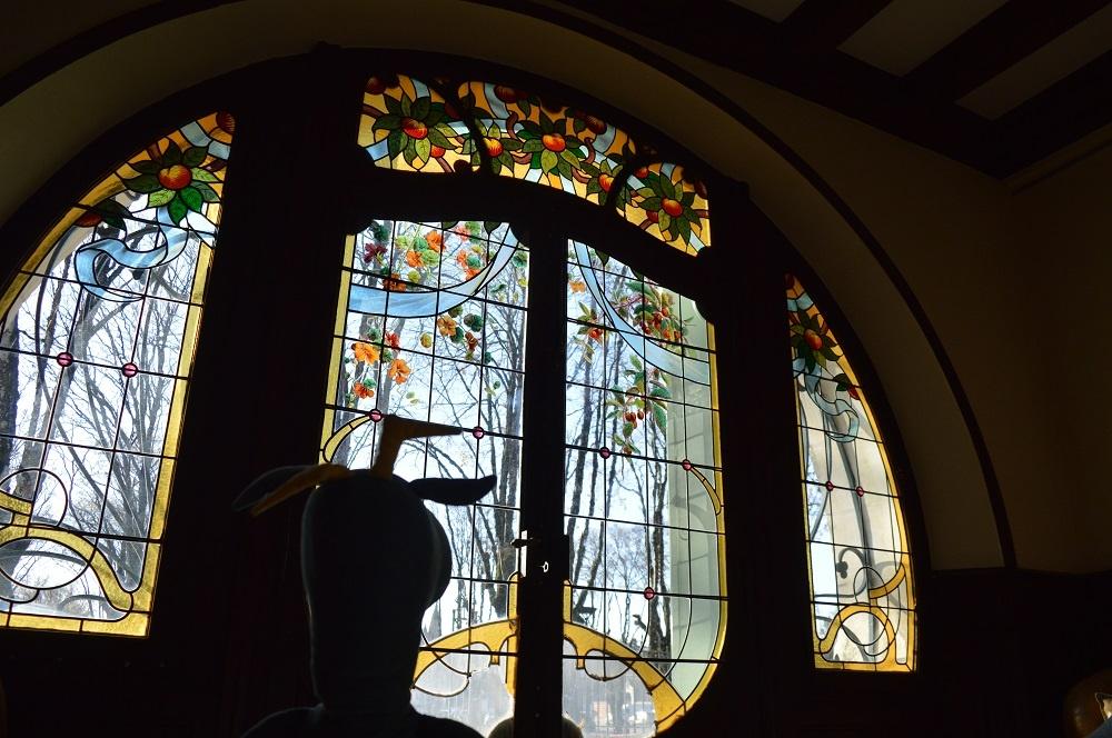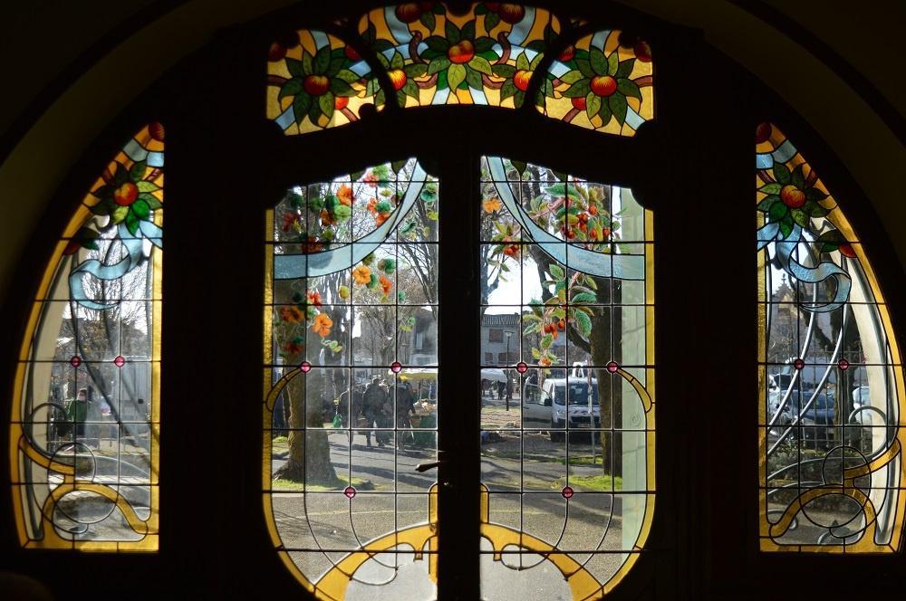 Dès mon arrivée, une immense porte se dresse devant moi, je me sens toute petite, elle me paraît infranchissable. Divisée en plusieurs parties de vitraux colorés et peints, elle déploie avec originalité les courbes d’un arbre ou d’une plante, éléments typiques de l’Art Nouveau. On peut y voir d’énormes chapiteaux décorés de branches de vigne, voilà ce dont parlait Madame N.