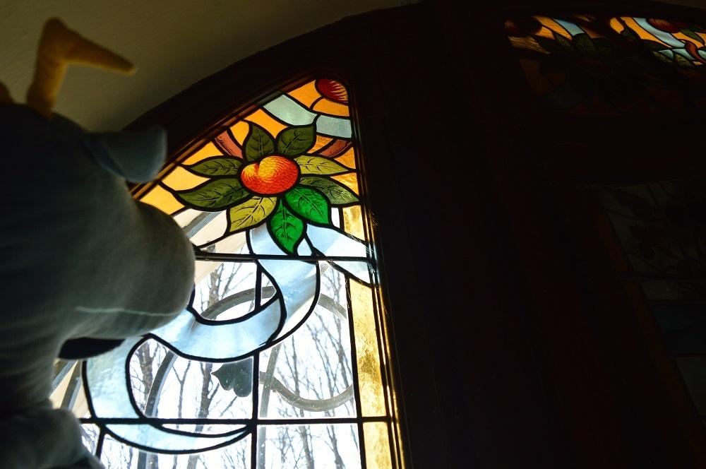 Je m'arrête un instant devant les vitraux que possède le bâtiment. Ils me donnent l’impression que l’entrée a été couverte d’une voûte de fleurs et de fruits, très vite, je sens mon ventre gargouiller