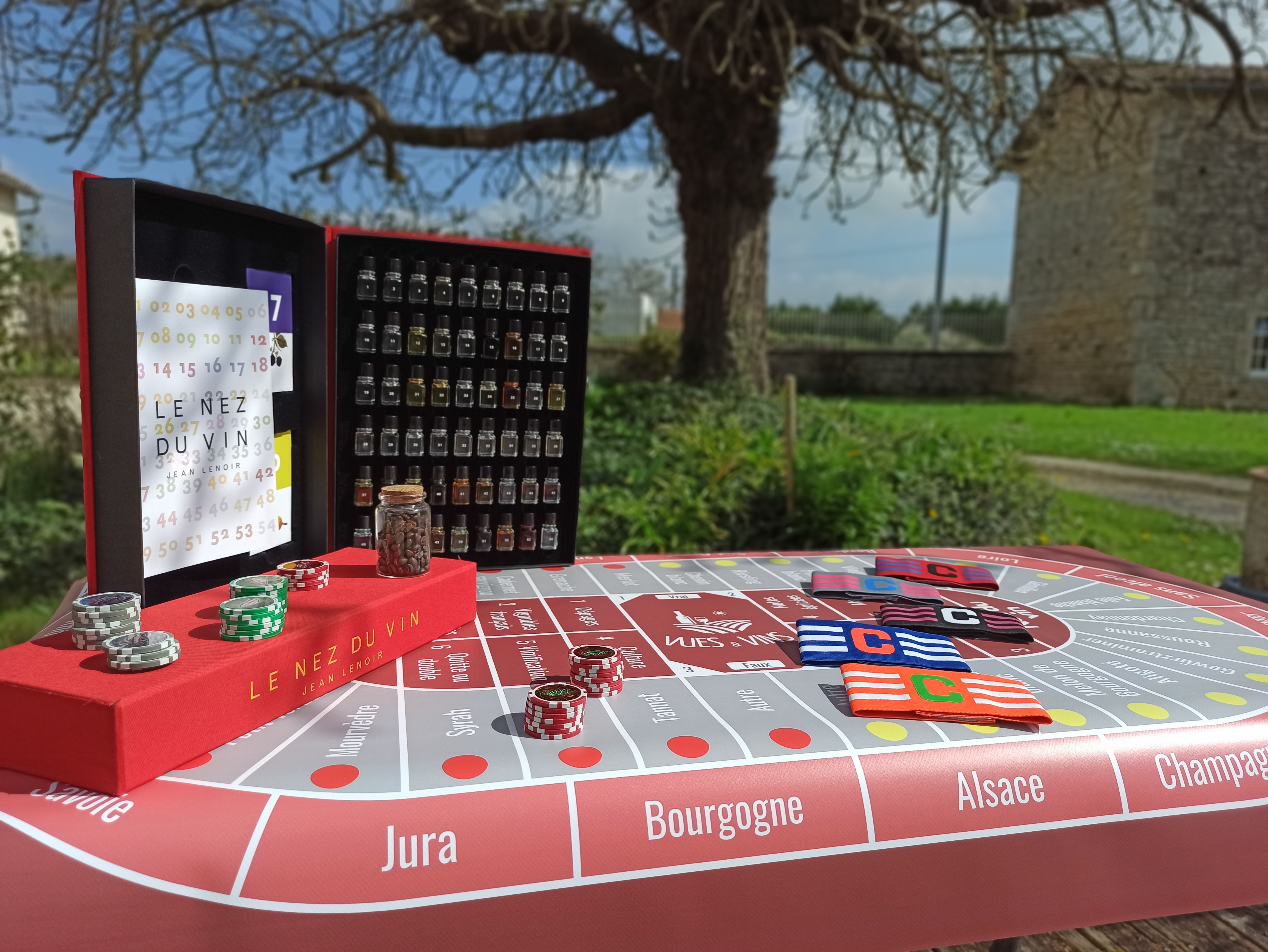 Au programme : apprentissage des étapes de dégustation, quiz, entraînement de sommelier avec le coffret « Le nez du vin » et dégustation de plusieurs vins à l'aveugle. Le tout est accompagné d'un tapis de jeu créé sur mesure.